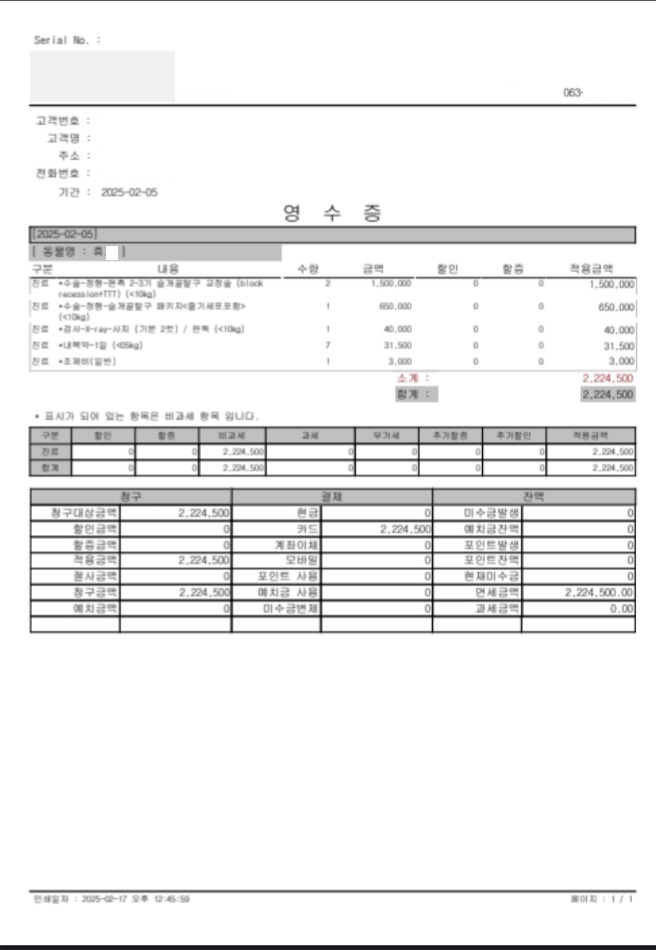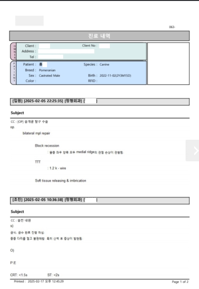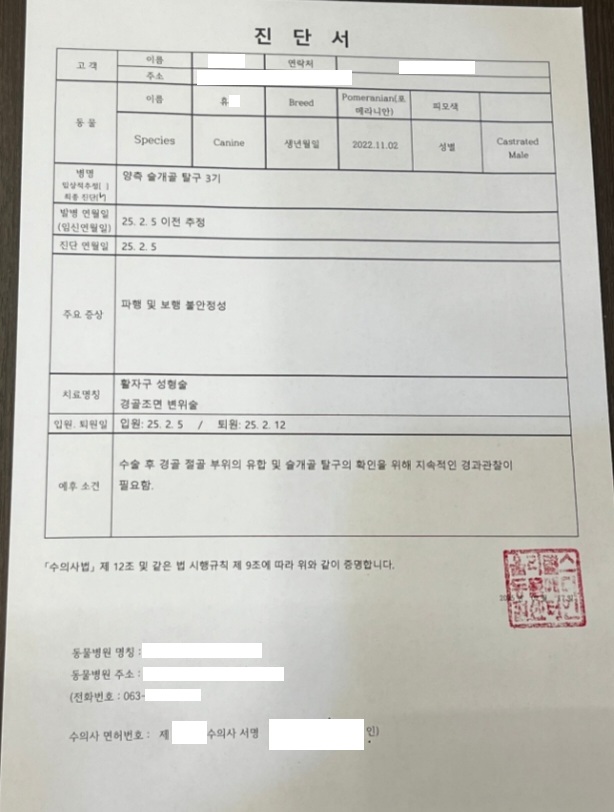 2025년 2월 5일 슬개골탈구 3기로 진단을 받아 보상이 가능하였습니다.