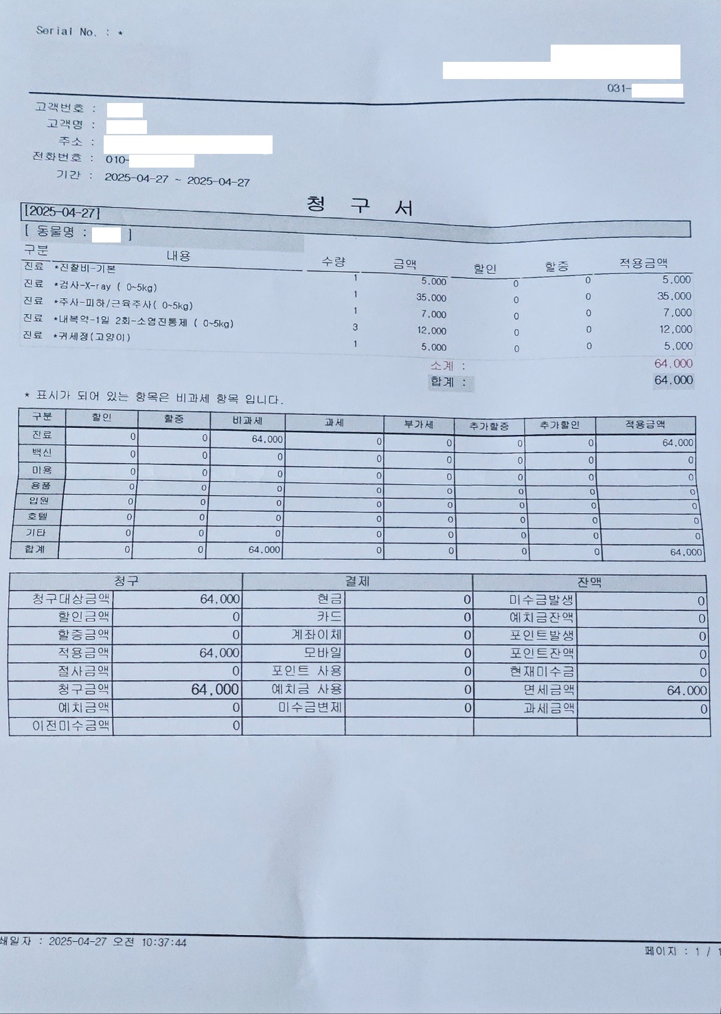64,000원의 치료비가 발생하였습니다.